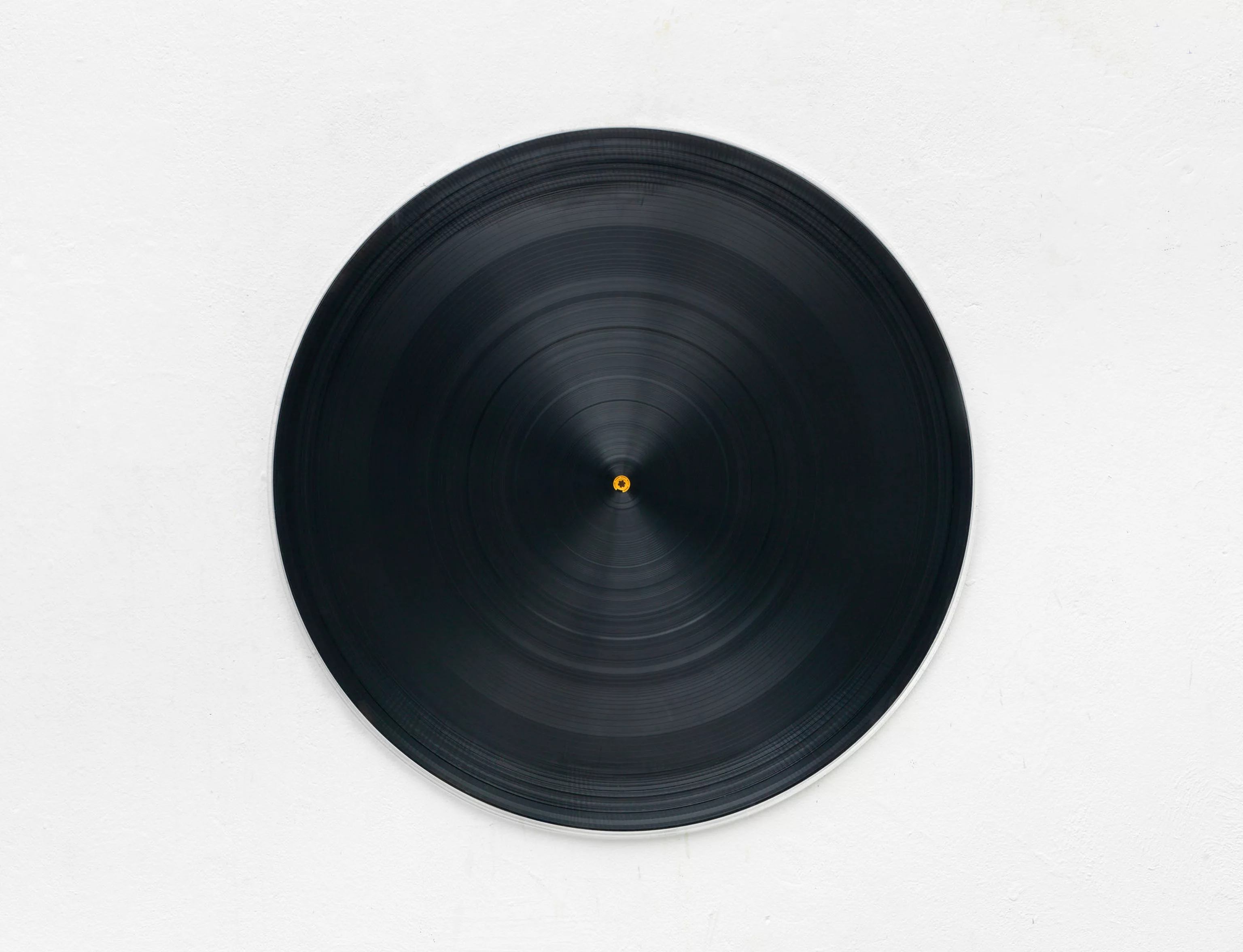 12. Gregor Hildebrandt, schwarze Kassettenschallplatte mit gelbem Rädchen, 2016. Cassette tape and cassette reel on wood with plexi cover, 92 × 92 cm (36 1/4 × 36 1/4 inches). © Gregor Hildebrandt.