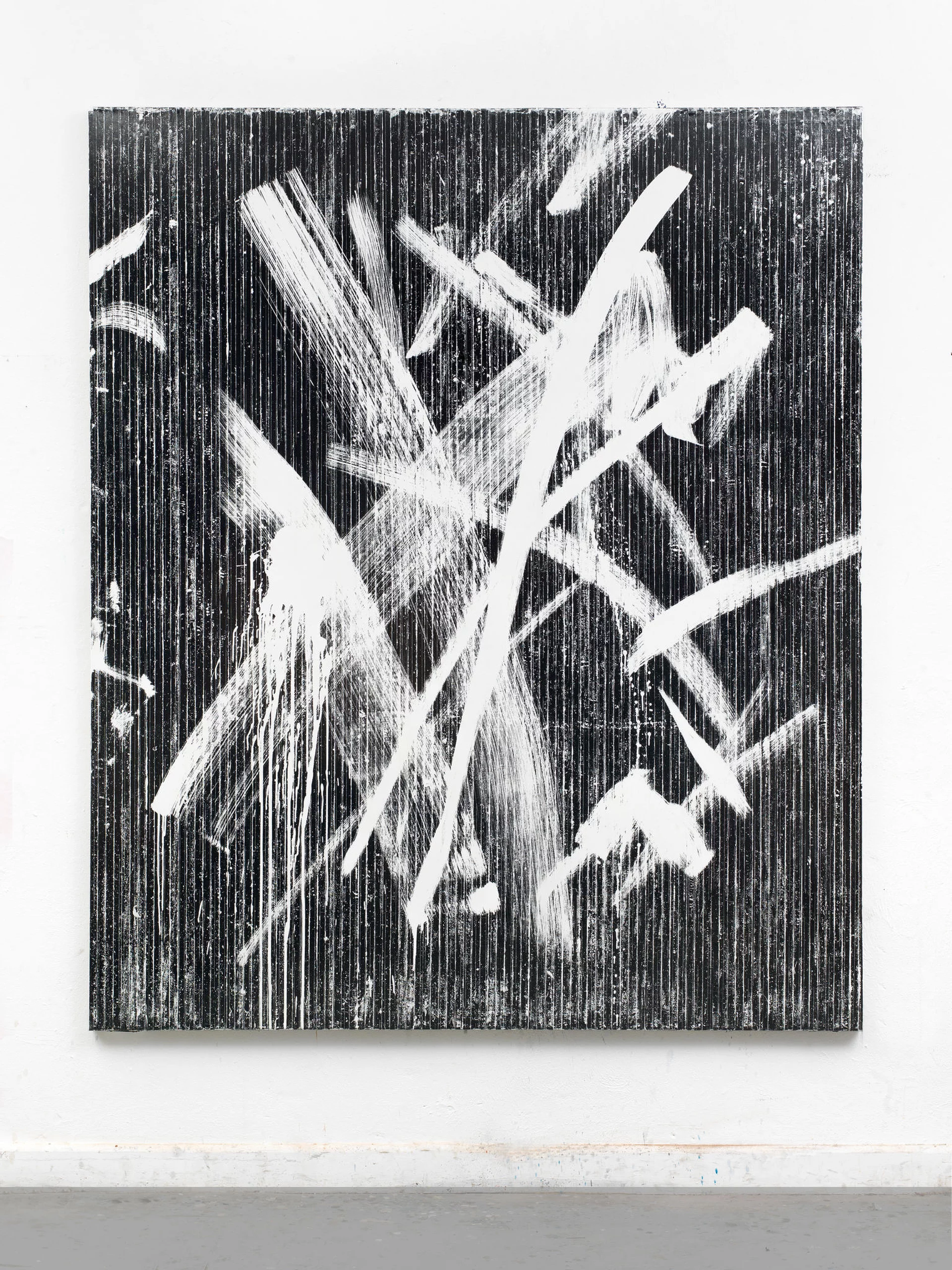 In Gregor Hildebrandt's work, sound is traditionally understood as immaterial and temporal; here it operates structurally through material transfer. Magnetic tape, vinyl, and recorded media are not referenced but physically impressed onto surface, turning sound into a spatial condition.