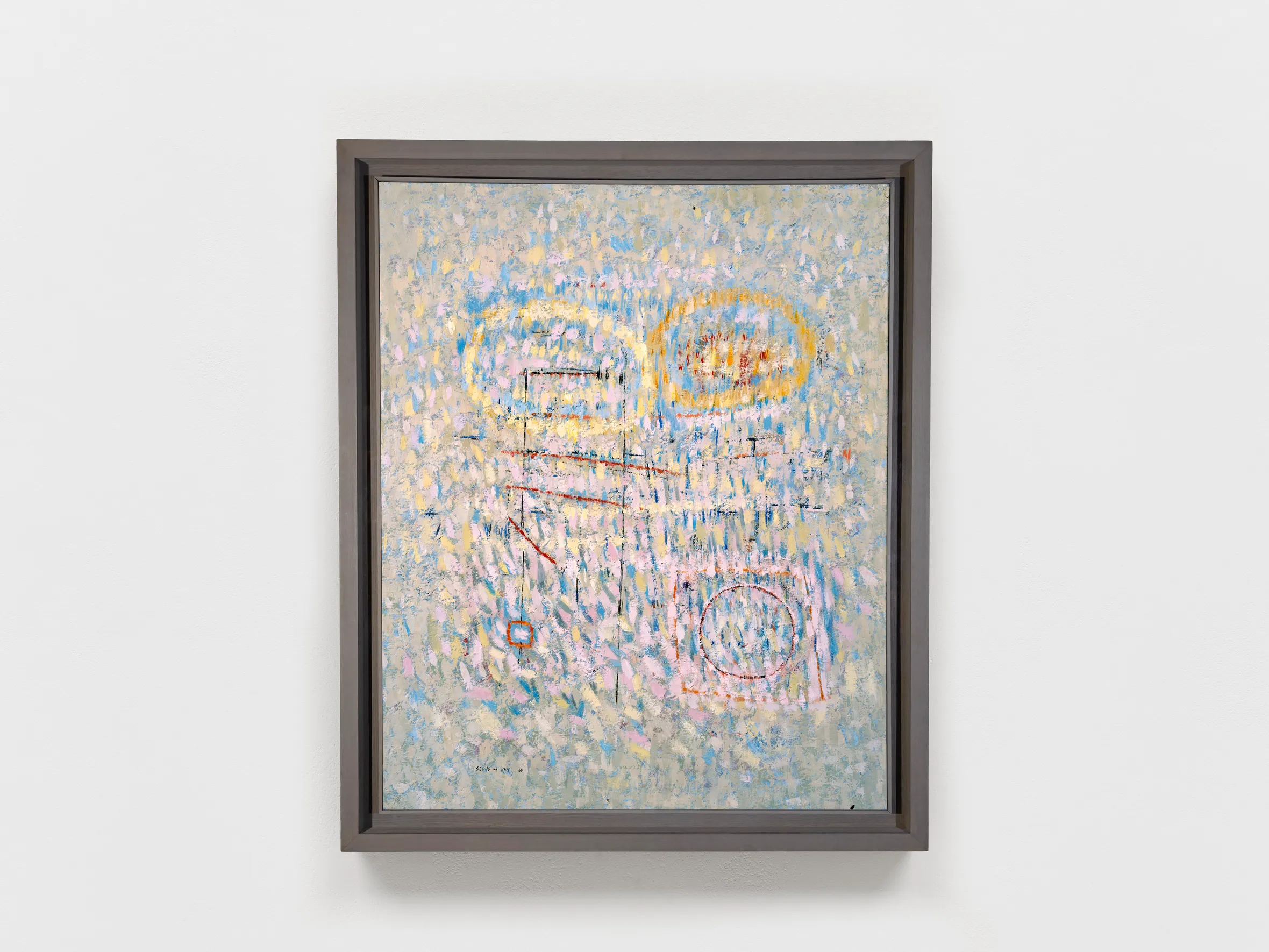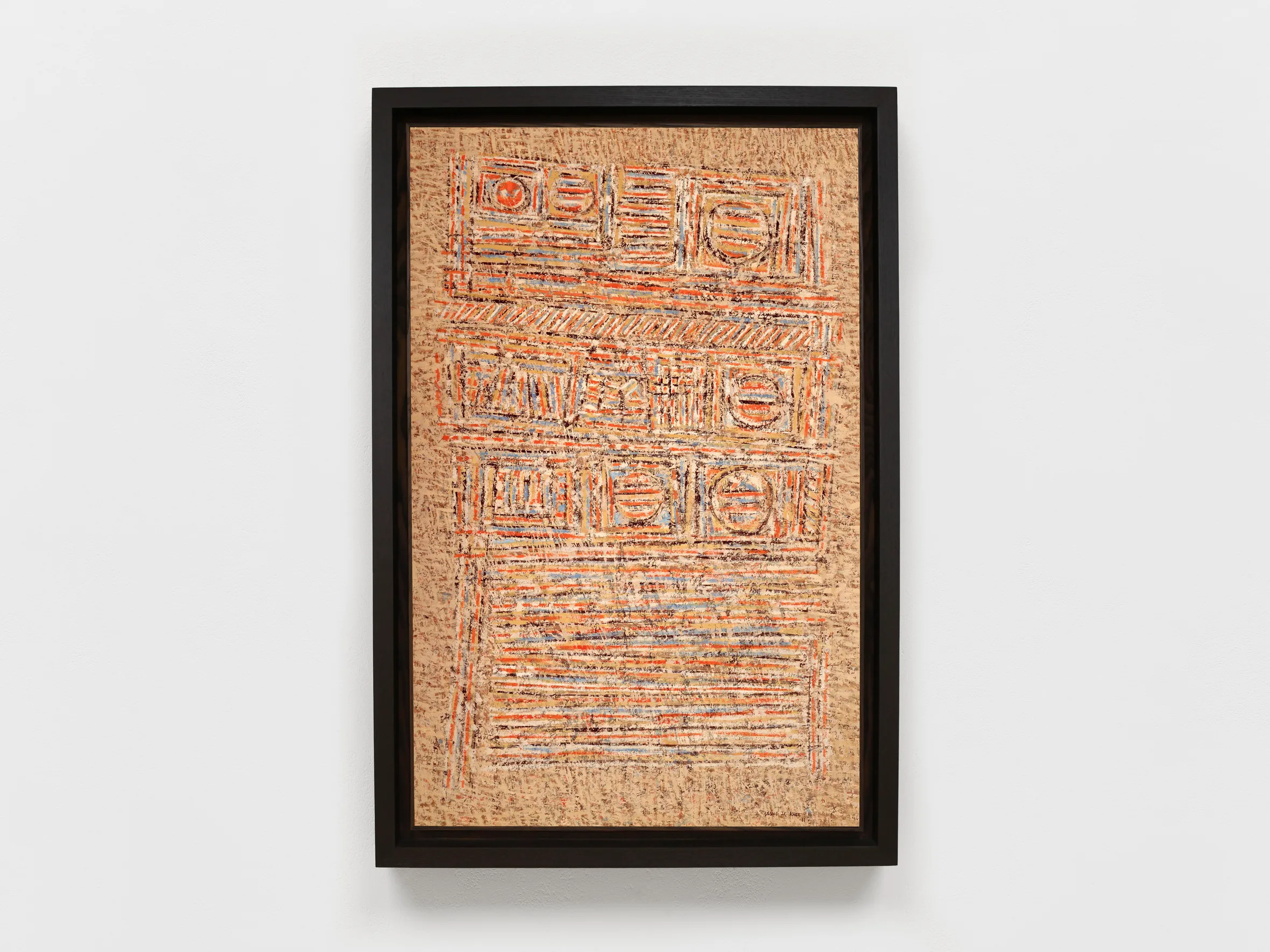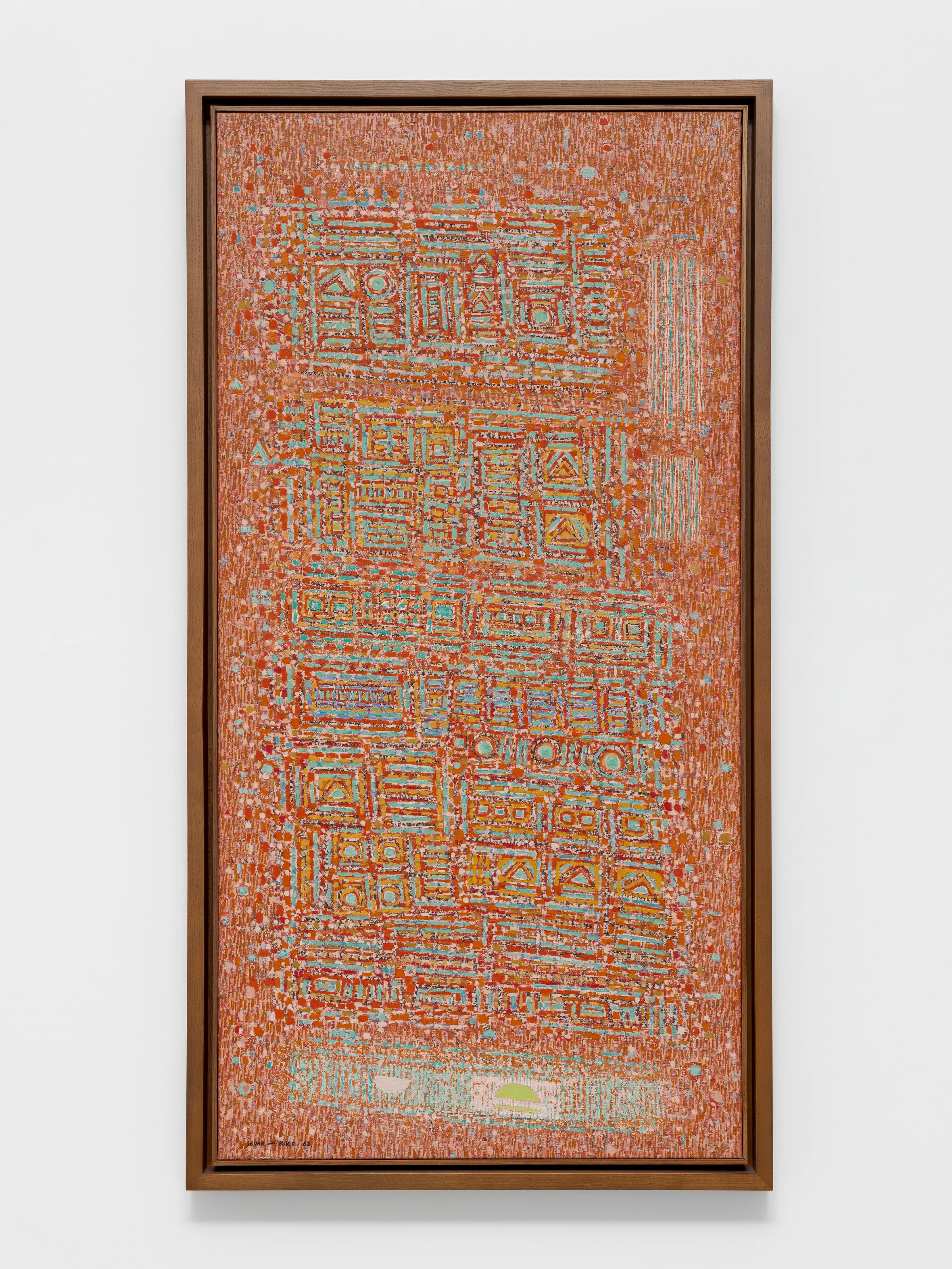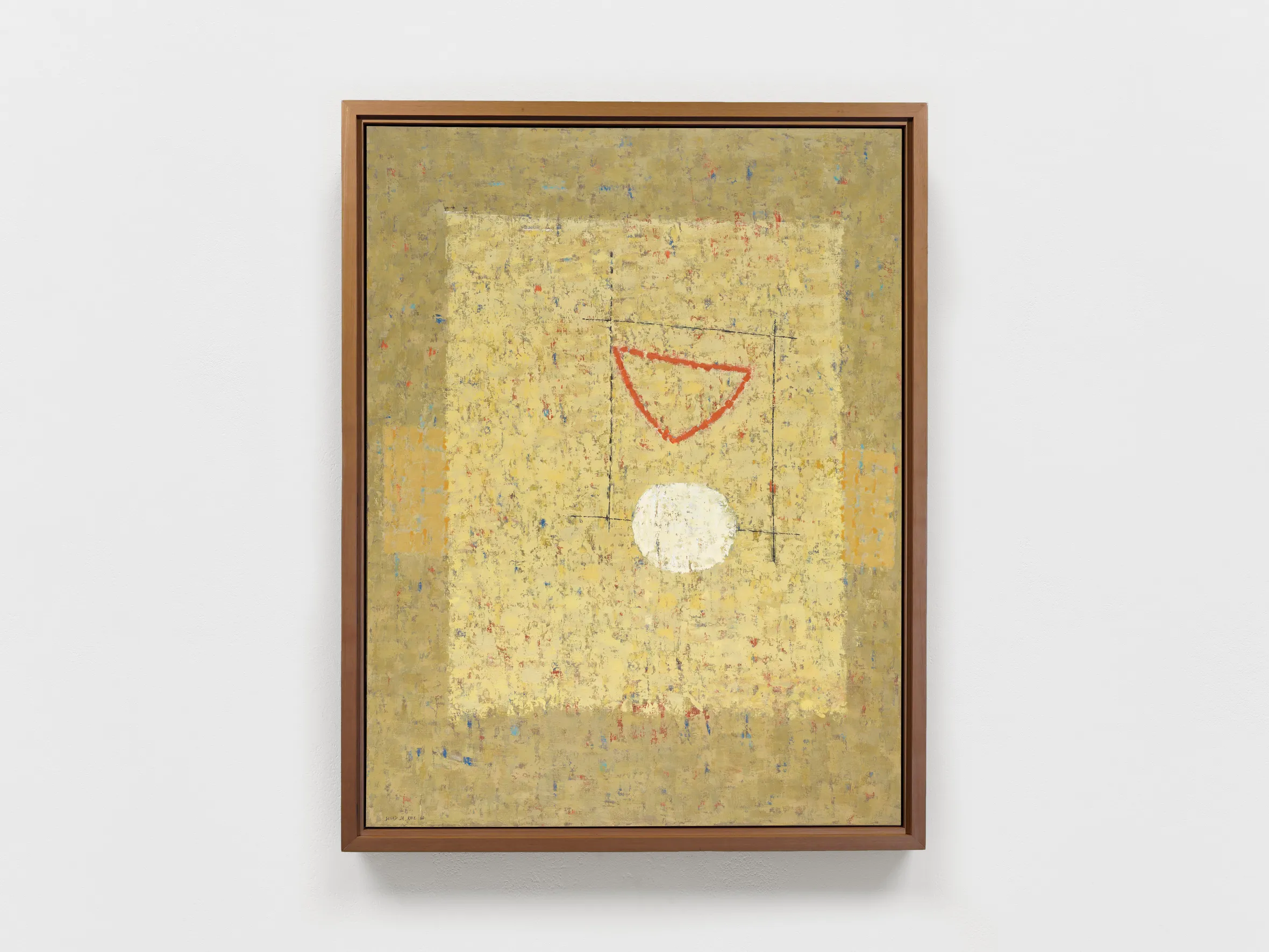 Rhee’s paintings arrive at a similar balance through repetition and accumulation. Her surfaces build slowly, stroke by stroke, forming dense fields that register time without dramatizing it. In works such as My Sweet City (1962) and In the Bed of Torrent (1961), geometric forms — squares, lines, intervals — emerge gradually, less as symbols than as structural guides. Variation is absorbed into the surface rather than emphasized, giving the work a quiet, calibrated rhythm.