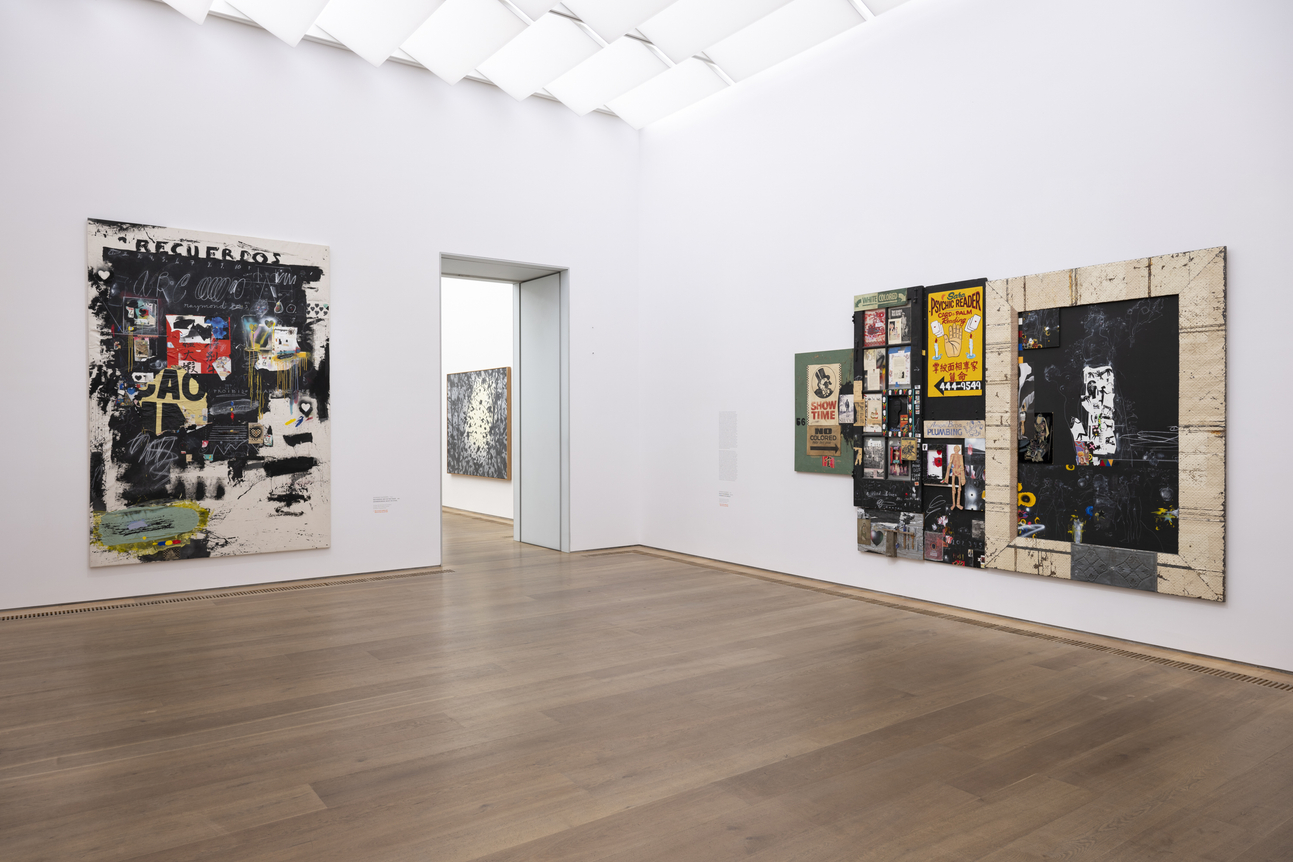 The exhibition spans works from the early 1980s through the 2000s, revealing not stylistic shifts but compositional consistency. In one painting, two black vases anchor the composition while color erupts from one form — containment and release held in balance. In another, chalk geometry, collage, text, and reproduction coexist across a dark ground. Density occurs within the surface rather than across the room. What emerges is not a closed argument but a sustained practice.