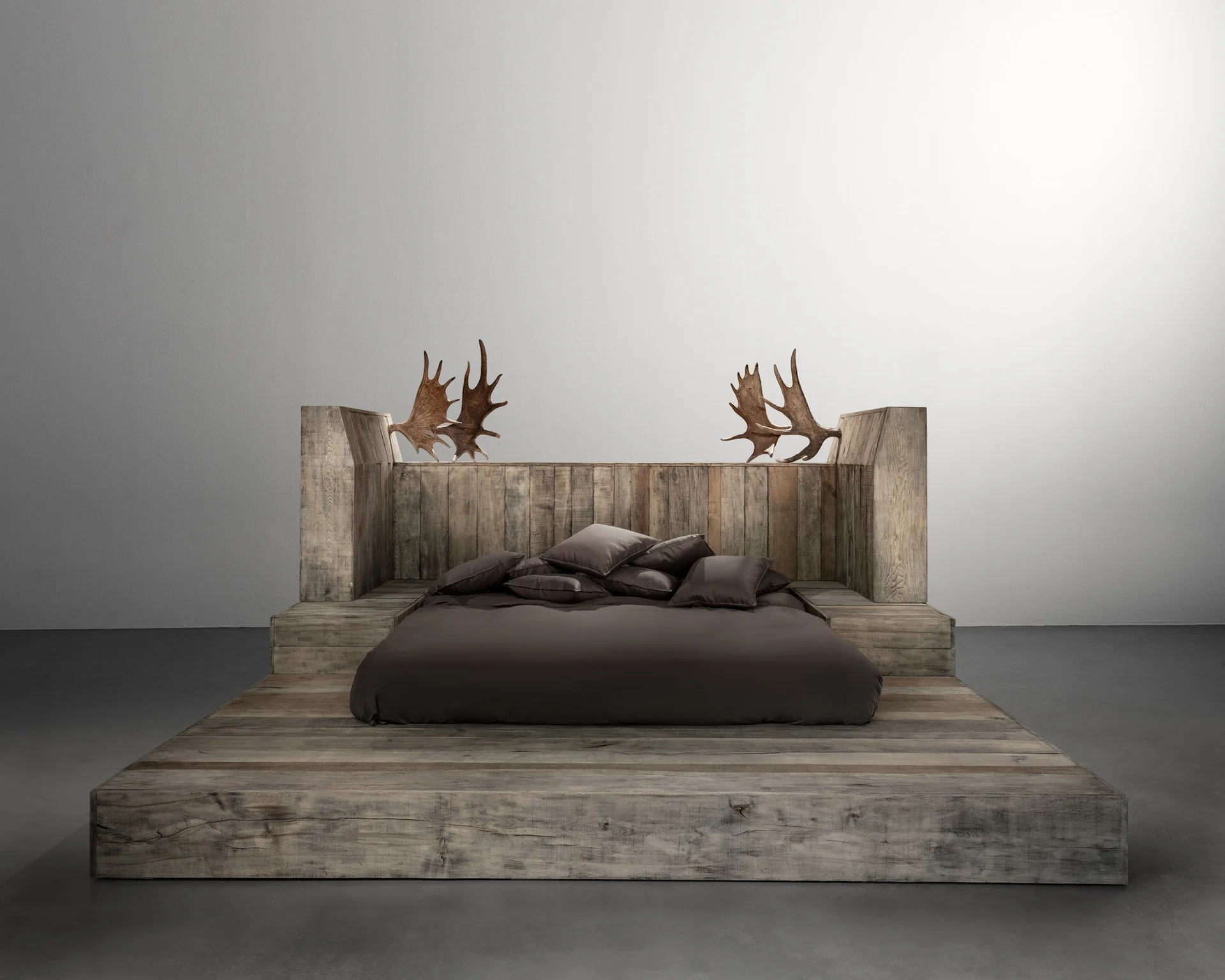 Because structure is load-bearing, elements are arranged to counterbalance rather than compose. Antlers interrupt planes as fixed weights. Platforms thicken the ground plane rather than elevate the body. Furniture does not invite adjustment or interaction; it holds position. The room operates as a field of resistance rather than a sequence of objects.