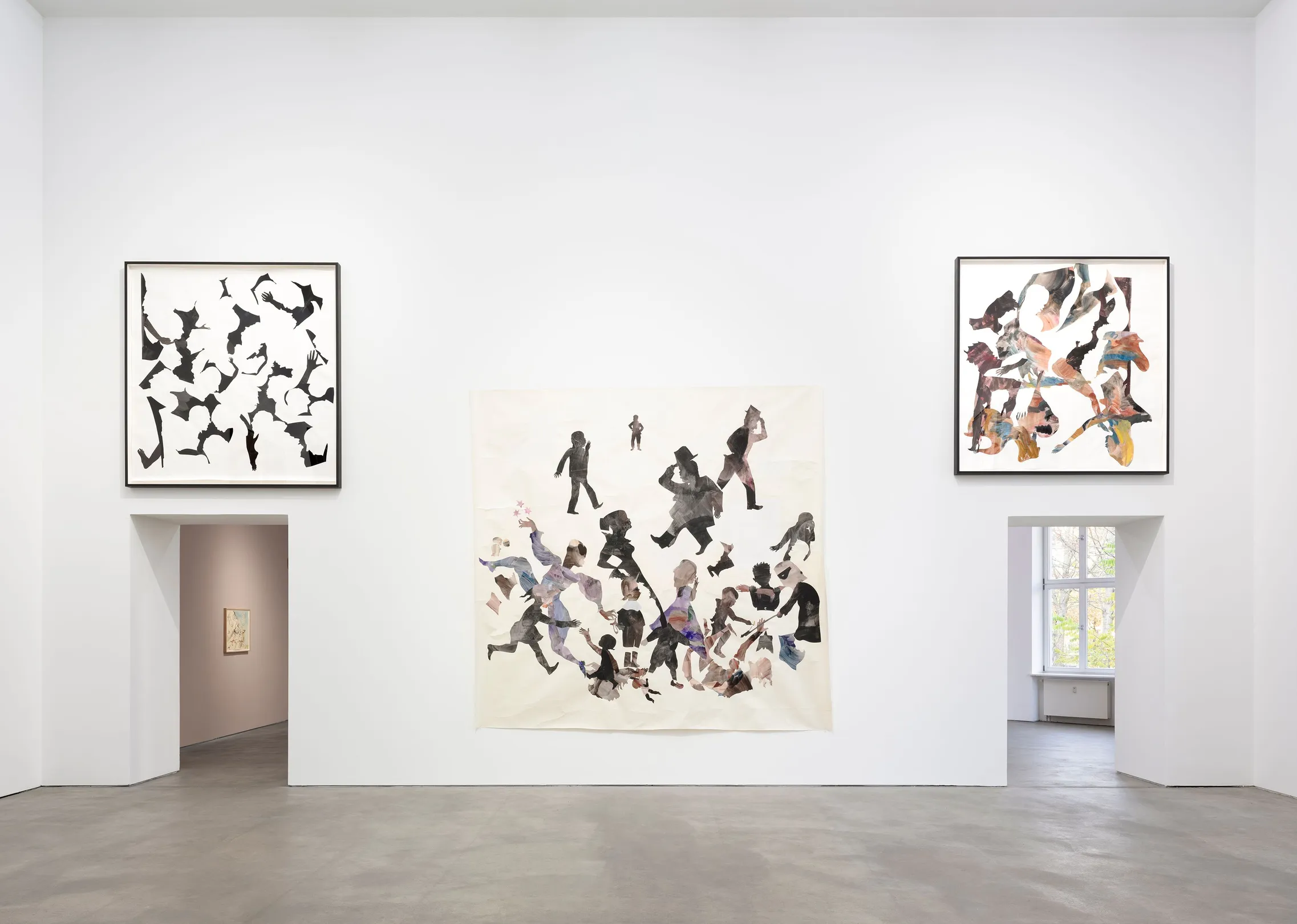 In this new sequence of large-scale collages at Sprüth Magers, Walker extends her cut-paper language beyond that stark polarity. Color seeps into contour. Ink interrupts the edge. The figures no longer hold firmly against a neutral field; they tilt, overlap, and fragment, loosening the stark legibility that once sealed figure from ground. In Inaugural Fantasia (2025), bodies invert and drift across the nearly five-meter span — some suspended mid-motion, others dissolving into watercolor wash. The ground feels less like a stage and more like an unsettled surface, as if the image itself resists fixed orientation.