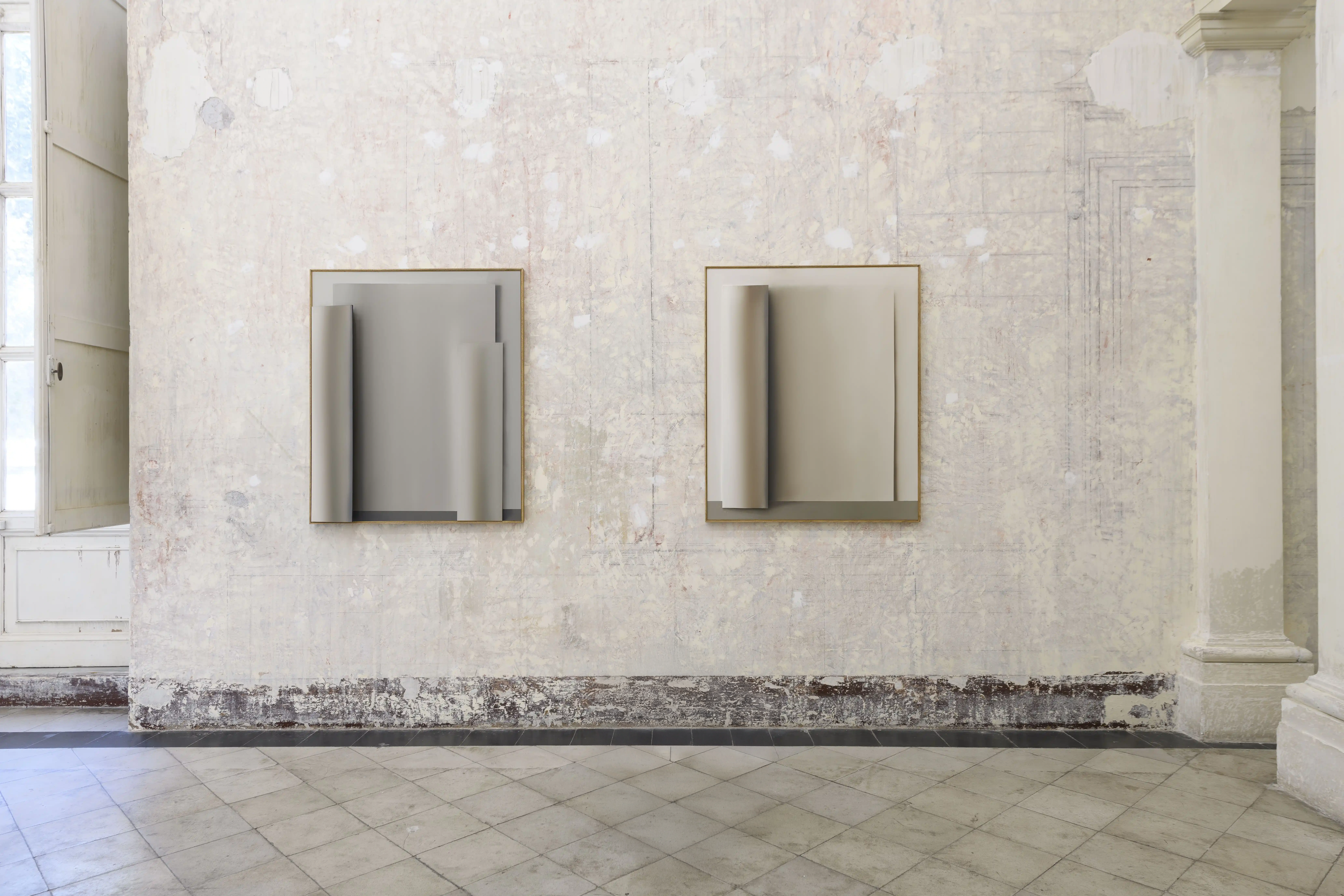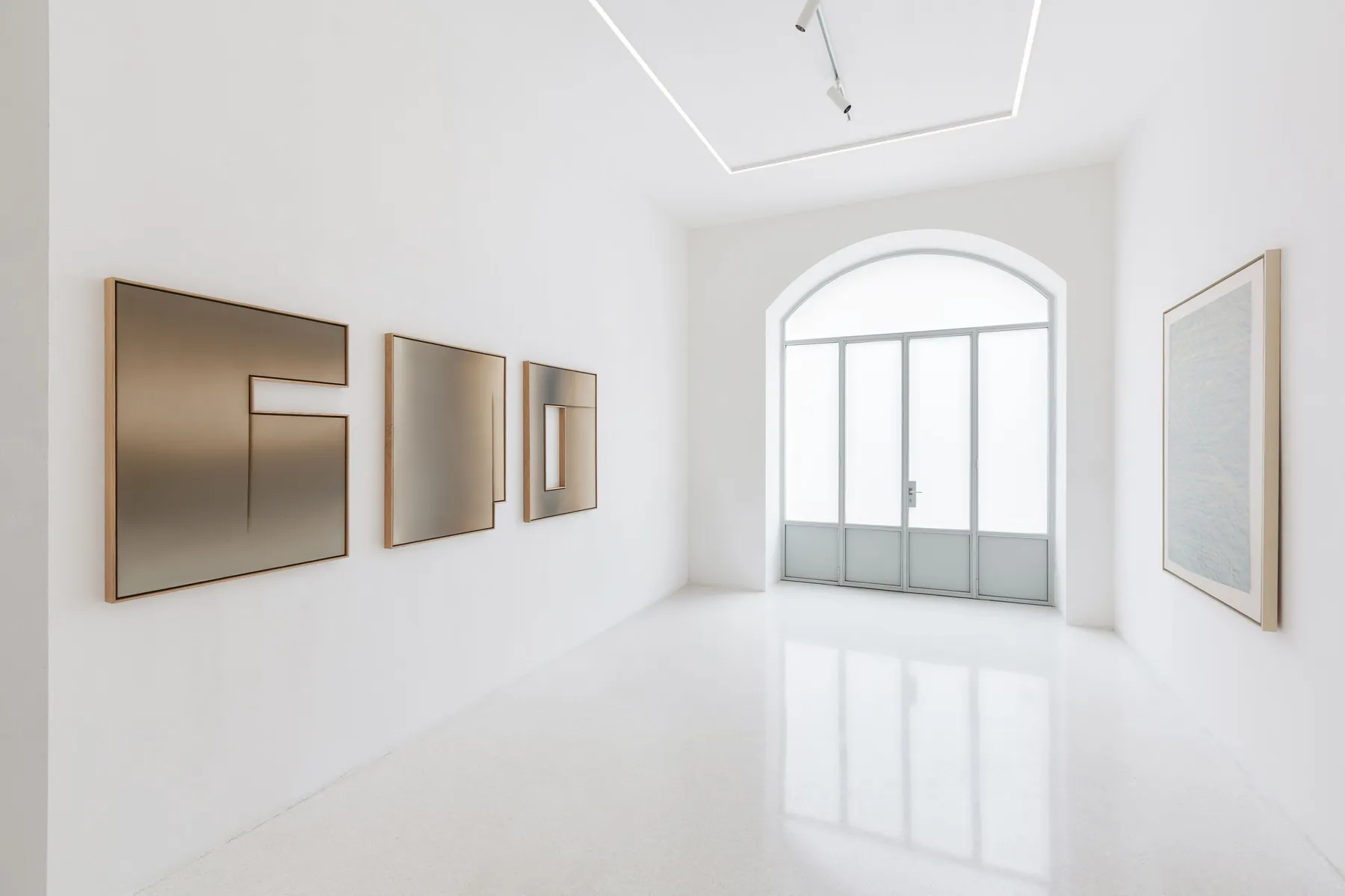 From a distance, the paintings appear cool and resolved. Up close, that resolution thins. The metallic sheen softens into canvas weave; apparent precision dissolves into atmosphere. What first reads as structural certainty begins to feel less assured.