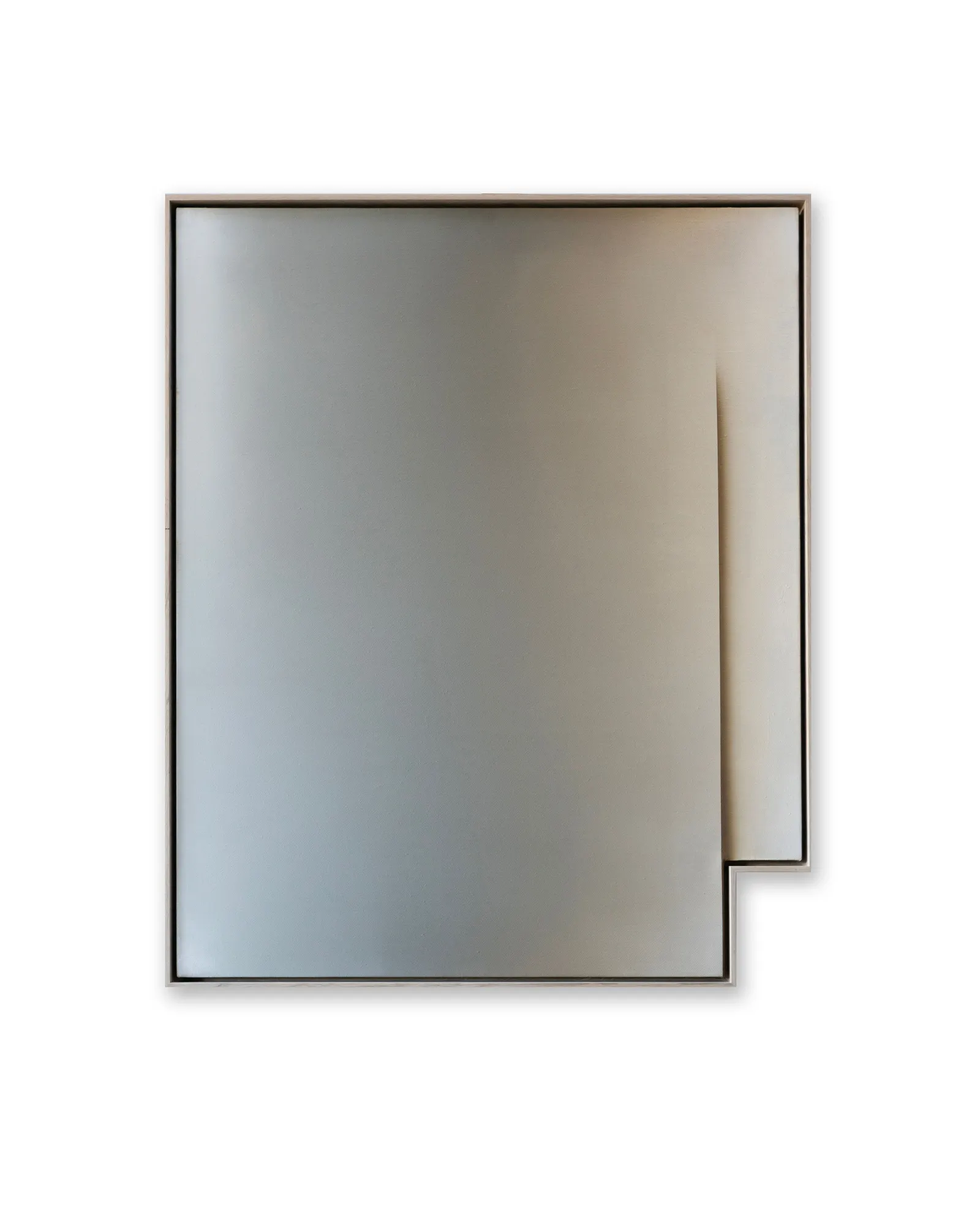In On Formality 17, 18, and 20 (2025), the support is physically cut or visually recessed. In some works, the incision is literal; in others, the depth is entirely painted. What appears recessed is tonal modulation. The shadow is rendered, not cast. The incision may be real; the depth it implies is not.