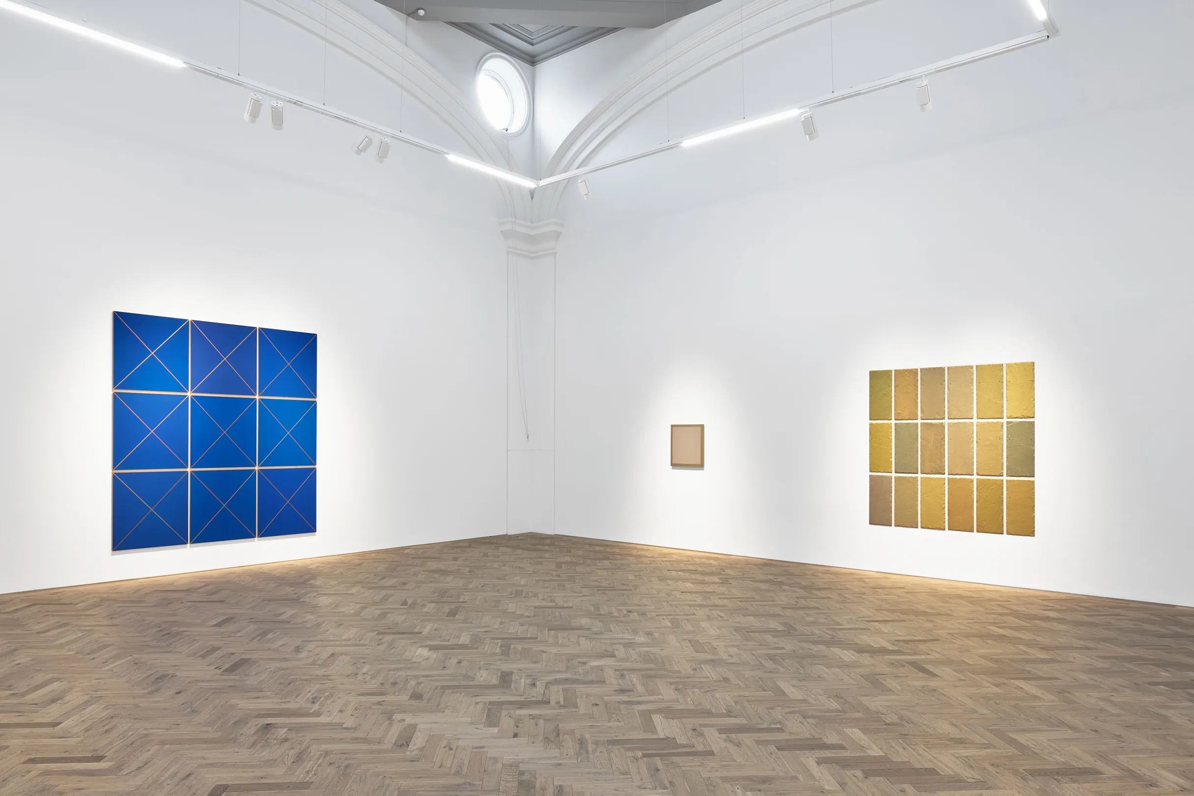 In Lines of Light (2023), structure moves inward. A nine-part blue field is crossed by diagonal metallic bands, introducing directional force within each panel. The grid no longer only organizes adjacency; it contains tension internally. Unity gives way to subtle fracture. The surface holds its coherence, but only through restraint.